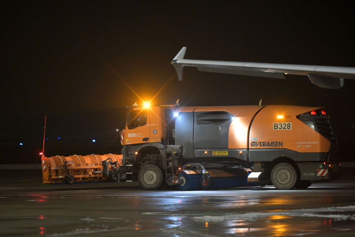 Ein Räumfahrzeug fährt über das Flugfeld des Berliner Flughafen BER. (Archivbild) Foto: Michael Bahlo/dpa