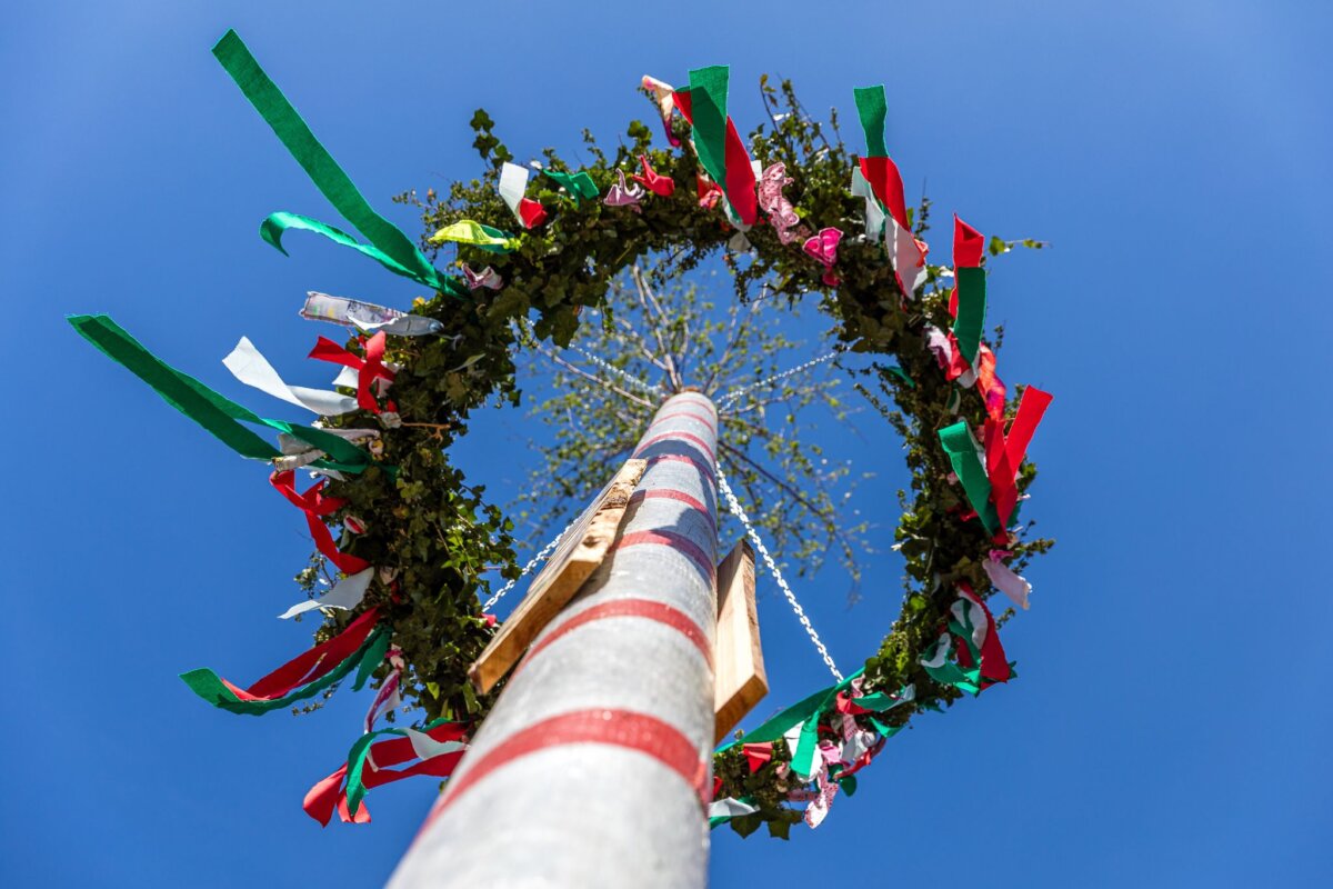 Der Maibaum ist meist ein von der Rinde befreiter, hoher Baumstamm. Er steht fast immer auf dem Dorfplatz und wird oft mit bunten Bändern und Girlanden geschmückt.