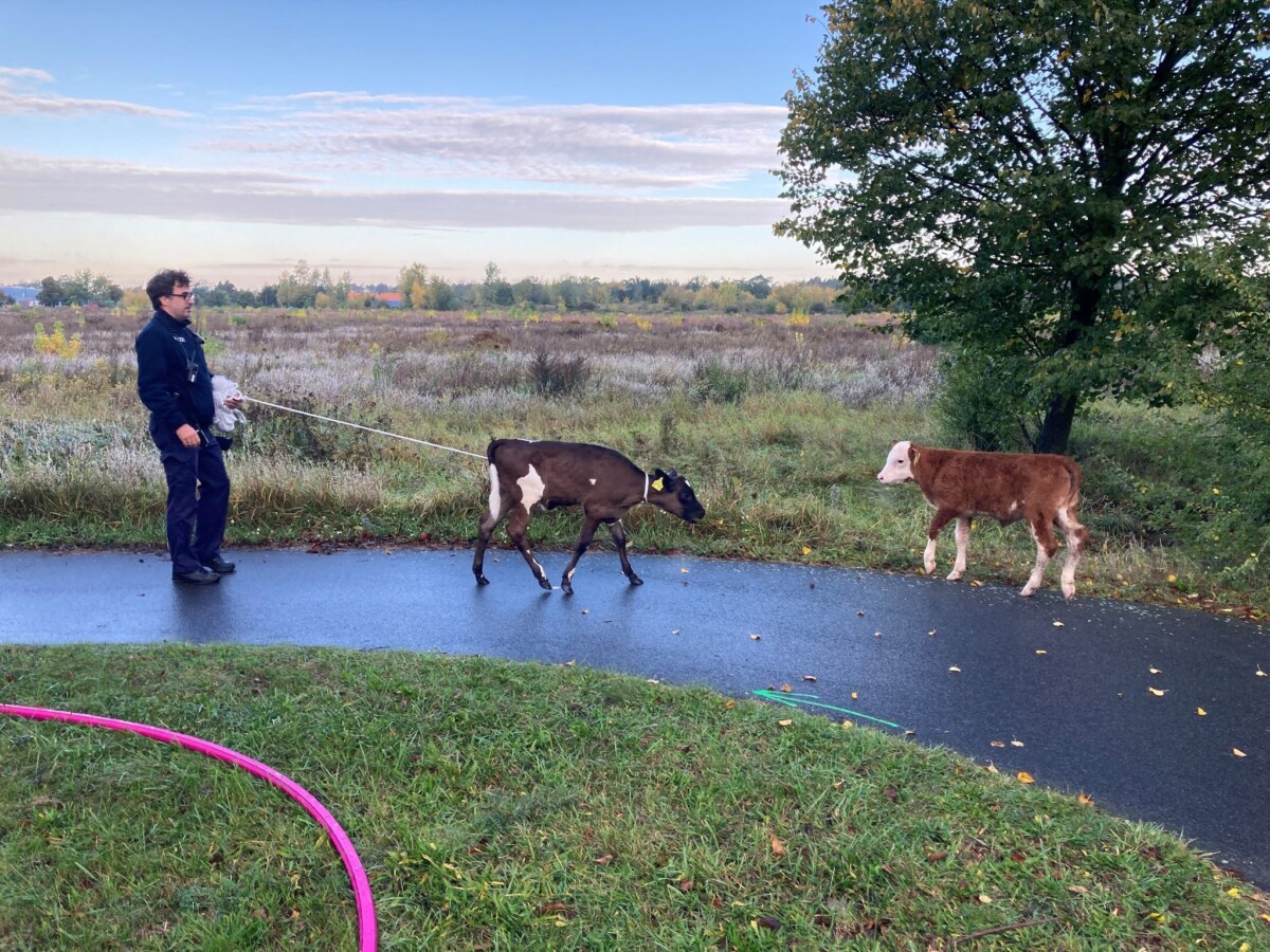 Einzelne Tiere konnten die Beamten auch festhalten, aber die Kälber, die in der Überzahl waren, behielten zunächst die Überhand. Die restlichen Kälber wurden von den zwei Streifenpolizisten auf einen Fahrradweg gedrängt. Dann nahmen die Beamten Kontakt mit den Besitzern auf, die die Tiere erfolgreich verluden.