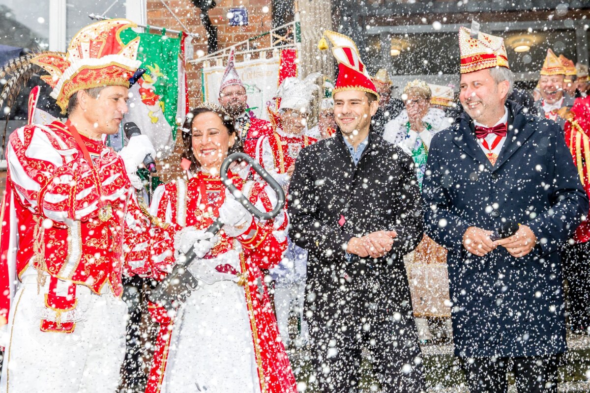 Auch in der ostdeutschen Karnevalshochburg Cottbus haben die Närrinnen und Narren das Rathaus übernommen. Das Stadtprinzenpaar erhielt den Rathausschlüssel von Oberbürgermeister Tobias Schick (SPD). Mehrere hundert Beteiligte und Schaulustige ließen sich nach Stadtangaben vom zwischenzeitlichen Regen nicht abschrecken. Sie sangen, tanzten, feierten nach dem traditionellen Kanonenschuss um 11.11 Uhr.