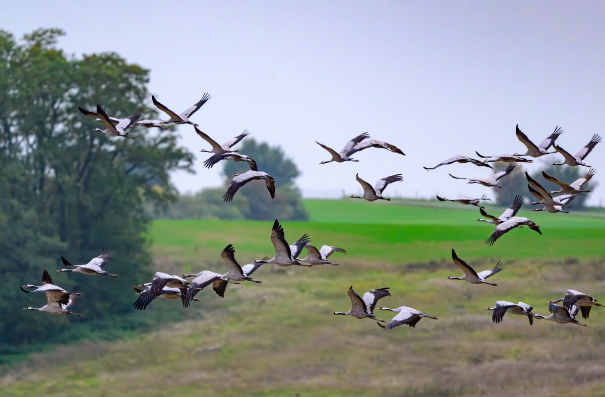 Nauen (dpa/bb) – Kraniche machen auf ihrem alljährlichen Weg gen Süden auch Rast in Brandenburg. Brandenburg ist «ideal», um die mehr als einen Meter großen Vögel zu beobachten, wie Helge May, Sprecher beim Naturschutzbund (Nabu), sagte. So kann man hier immer wieder unterwegs auf Kraniche stoßen, ob am Himmel beim Fliegen oder Rasten auf Ackern. Um die Vögel nicht aufzuschrecken, empfiehlt er, diese entweder aus dem Auto oder aus sicherer Entfernung vom Straßenrand zu beobachten.