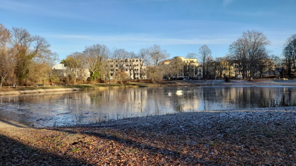Wir verlassen das Gelände an der Hertzstraße, bestaunen an der Ecke Fontanestraße eine hübsche Wandmalerei und biegen links ab in die Garibaldistraße. Die führt uns zuerst zum idyllischen Garibalditeich, einem Spielplatz und dann zur Tollerstraße. Schräg rechts ist der Zugang zum Wilhelmsruher See, ein reizvolles Naherholungsgebiet. Wir gehen rechts am See entlang und verlassen das Terrain am südlichen Ende.