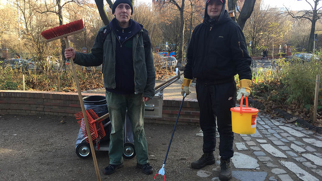 An zwei Tagen pro Woche sammeln Klienten des Notdienstes für Suchtmittelgefährdete und –abhängige Berlin e. V. im Rahmen des Programms „Aktion Sauberes Berlin“ an besonderen Schwerpunkten im Bezirk Drogenkonsumutensilien, die an Grünstreifen, Parkanlagen, an U- und S-Bahnhaltestellen oder Spielplätzen weggeworfen wurden.