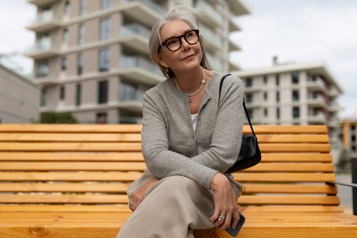 Lächelnde Frau mit grauem Haar und moderner Brille sitzt auf einer Holzbank. Bild: IMAGO / Zoonar